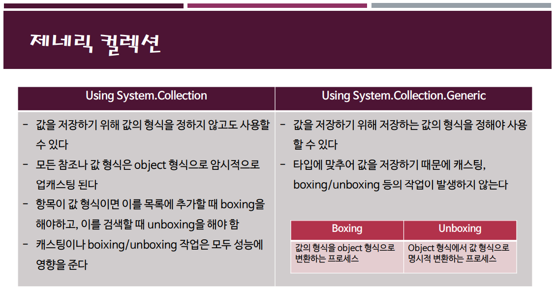 제네릭 컬렉션은 값을 저장하기 위해 저장하는 값의 형식을 정해야 사용할수 있다. 타입에 맞추어 값을 저장하기 때문에 캐스팅, boxing / unboxing 등의 작업이 발생하지 않는다.