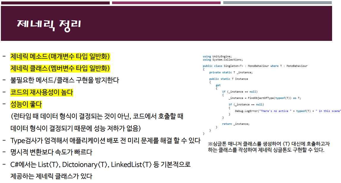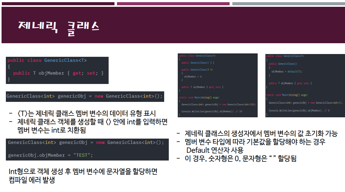 - C#에서는 List<T>, Dictionary<T>, LinkedList<T> 등 기본적으로 제공하는 제네릭 클래스가 있다.