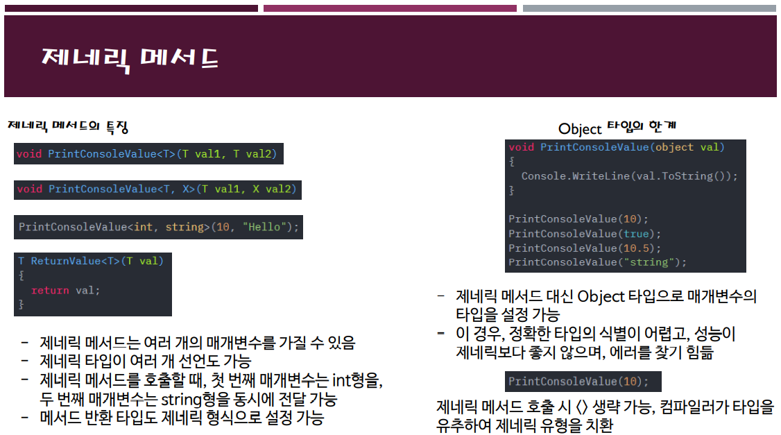 - 제네릭 메서드를 호출할 때, 첫 번째 매개변수는 int형을, 두 번째 매개변수는 string형을 동시에 전달할 수 있다.