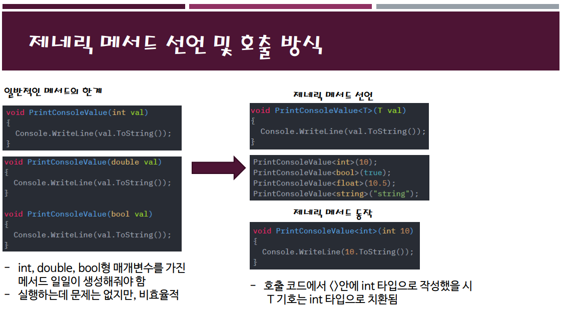일반적인 메서드는 int. double. bool형 등 매개변수를 가진 메서드들을 일일히 생성해줘야 한다. 물론 실행에는 문제 없지만 매우 비효율적인 방식이라고 볼 수 있다. 이를 해결할 수 있는 방법은 제네릭 메서드를 선언해주는 것인데 메서드<T> 형식으로 코드를 작성한다. 호출 코드에서 <>안에 int타입으로 작성하면 T기호는 int 타입으로 치환된다. 다른 타입도 마찬가지이다.
