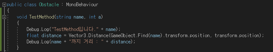 TestMethod()라는 메서드를 만들고 (string name, int a)라는 2개의 매개변수를 생성해주었다.