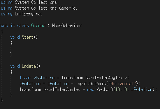 그리고 zRotation 값에 사용자의 Input이 있는 경우 -1(왼쪽), +1(오른쪽)만큼 움직일 수 있게 Input.GetAxis("Horizontal)"을 추가했다.