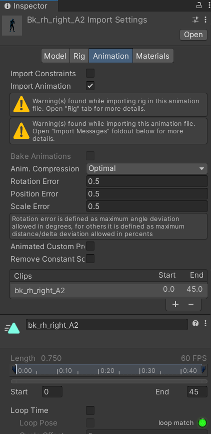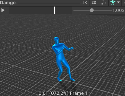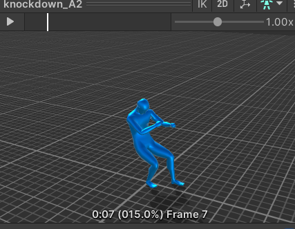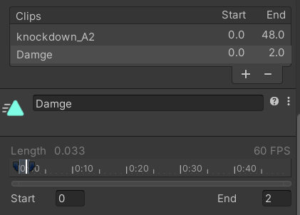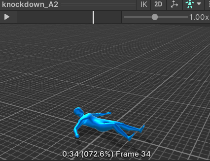 위의 애니메이션 클립은 KnockDown, 죽는 애니메이션 클립이다. 우리는 클립 초반에 몸이 뒤로 젖혀지는 부분만 따로 추출해 피격 시 넉백이 되는 애니메이션 클립으로 직접 만들어 줄 수 있다.