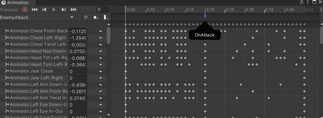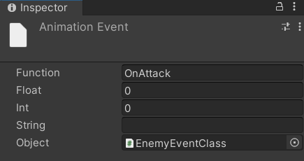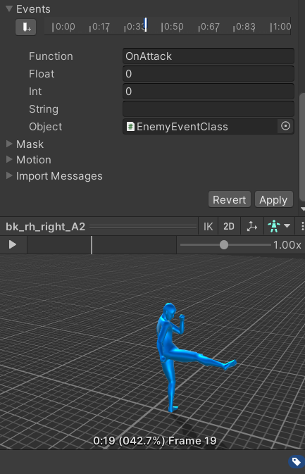 발차기 동작에서 정확히 발을 쭉 뻗는 모션은 19 Frame, 약 0.4초 쯤에 실행된다. 이 지점에서 Add Key frame을 해서 key를 생성해 주면 된다. 그리고 Function에 OnAttack이라는 함수를 선언해주었고 EnemyEventClass 스크립트를 작성해 Object에 연결해 준 뒤 Apply 해주면 된다.